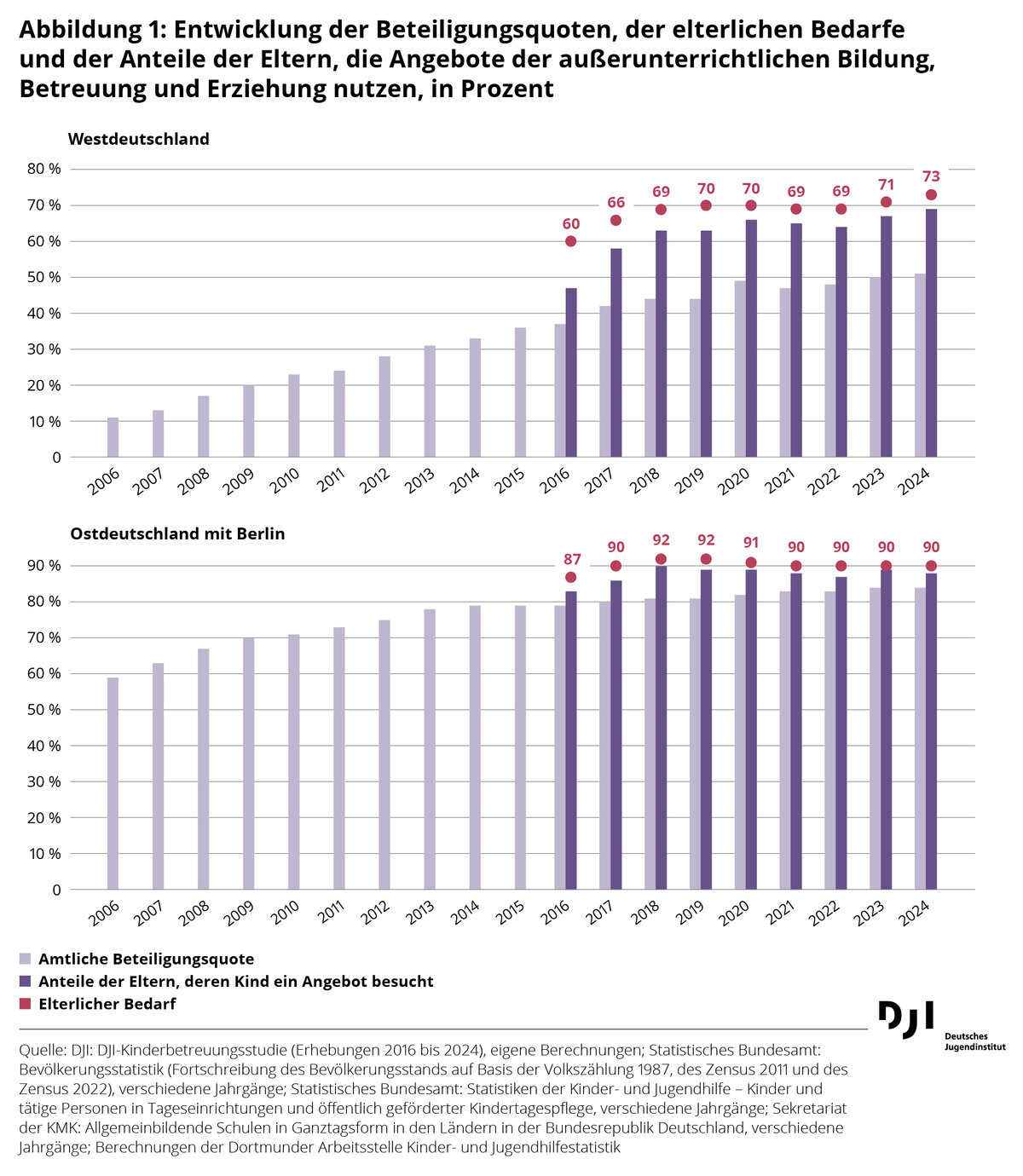 Relativiert an den circa 3,3 Millionen Grundschulkindern in Deutschland heißt das, dass im Jahr vor Inkrafttreten des Rechtsanspruchs mehr als 100.000 Familien einen vollständig ungedeckten Bedarf haben. Aus dem Projekt „Vorausberechnungen von Platz- und Personalbedarfen für die Kindertagesbetreuung und ganztägige Angebote für Grundschulkinder“ (VoKi) des Forschungsverbunds DJI/TU Dortmund geht außerdem hervor, dass unter Berücksichtigung der demografischen Veränderungen in Westdeutschland auch bis zum vollumfänglichen Inkrafttreten des Rechtsanspruchs im Schuljahr 2029/2030 noch weiter ausgebaut werden muss, um diesen zu erfüllen. In Ostdeutschland führen die demografischen Rückgänge hingegen dazu, dass zum Ende des Jahrzehnts weniger Plätze benötigt werden als zuletzt vorhanden (Meiner-Teubner 2025).