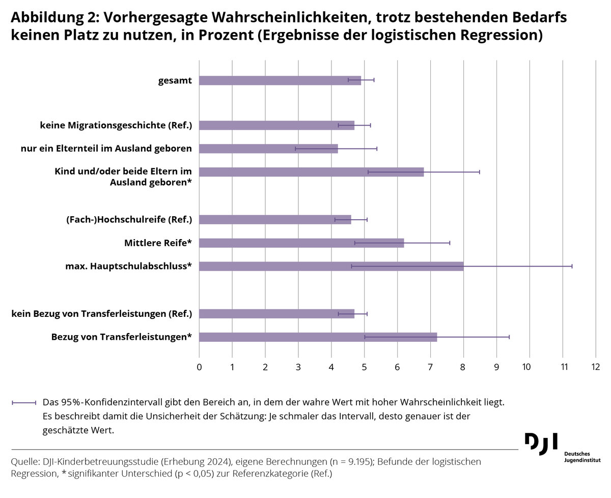 Weitere Analysen im Rahmen der DJI-Kinderbetreuungsstudie zeigen, welche Bevölkerungsschichten von ungedeckten Bedarfen in besonderem Maße betroffen sind. Erwartungsgemäß hängen Bedarf und Nutzung von der Erwerbstätigkeit der Mutter und der Wohnregion ab. Hält man diese Faktoren konstant, zeigen sich die größten Probleme im Zugang für Familien mit beidseitiger Migrationsgeschichte ebenso wie für Familien mit niedrigem Bildungshintergrund oder mit Bezug von Transferleistungen (siehe Abbildung 2). Folglich haben genau jene Familien, die zur Minimierung der ungleichen Bildungschancen in Deutschland mit dem Ausbau der ganztägigen Angebote erreicht werden sollten, eine erhöhte Wahrscheinlichkeit, keinen Platz zu erhalten, obwohl sie sich einen solchen wünschen.