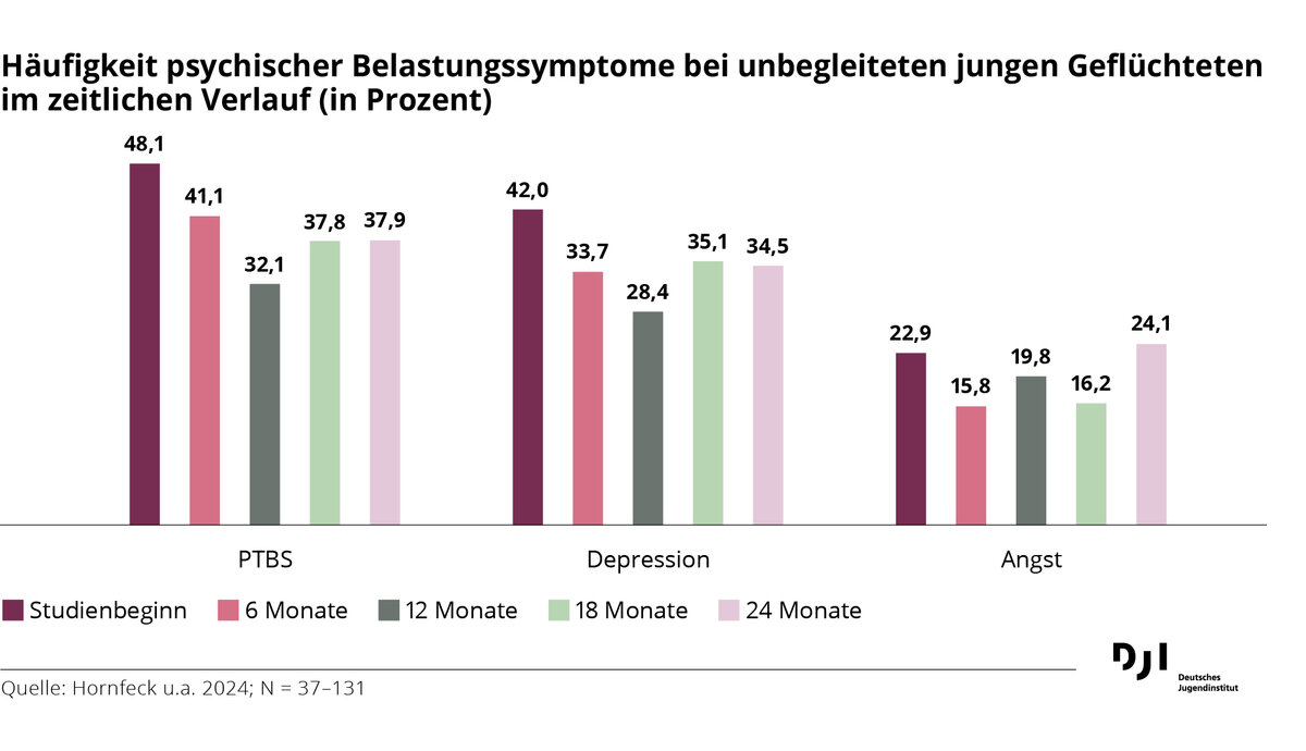 Im Rahmen des Verbundprojekts wurden insgesamt mehr als 600 unbegleitete junge Geflüchtete, die vor allem in stationären Wohngruppen der Jugendhilfe lebten, zu ihren psychischen Belastungen befragt. 120 dieser Jugendlichen, die 2020 und 2021 in die Studie aufgenommen wurden, wurden von DJI-Forschenden 24 Monate lang begleitet und wiederholt befragt. Dabei ging es um psychopathologische Symptome, das Erleben von Postmigrationsfaktoren und Teilhabemöglichkeiten. Die Ergebnisse zu psychischen Belastungen entsprechen internationalen Befunden. Die eingesetzten Screening-Instrumente belegten zu Beginn der Erhebung hohe Raten klinisch relevanter Symptome von PTBS, Depressionen und Angststörungen, wobei das Ausmaß der Symptome über einen Zeitraum von zwei Jahren anhaltend hoch blieb (Hornfeck u.a. 2024).