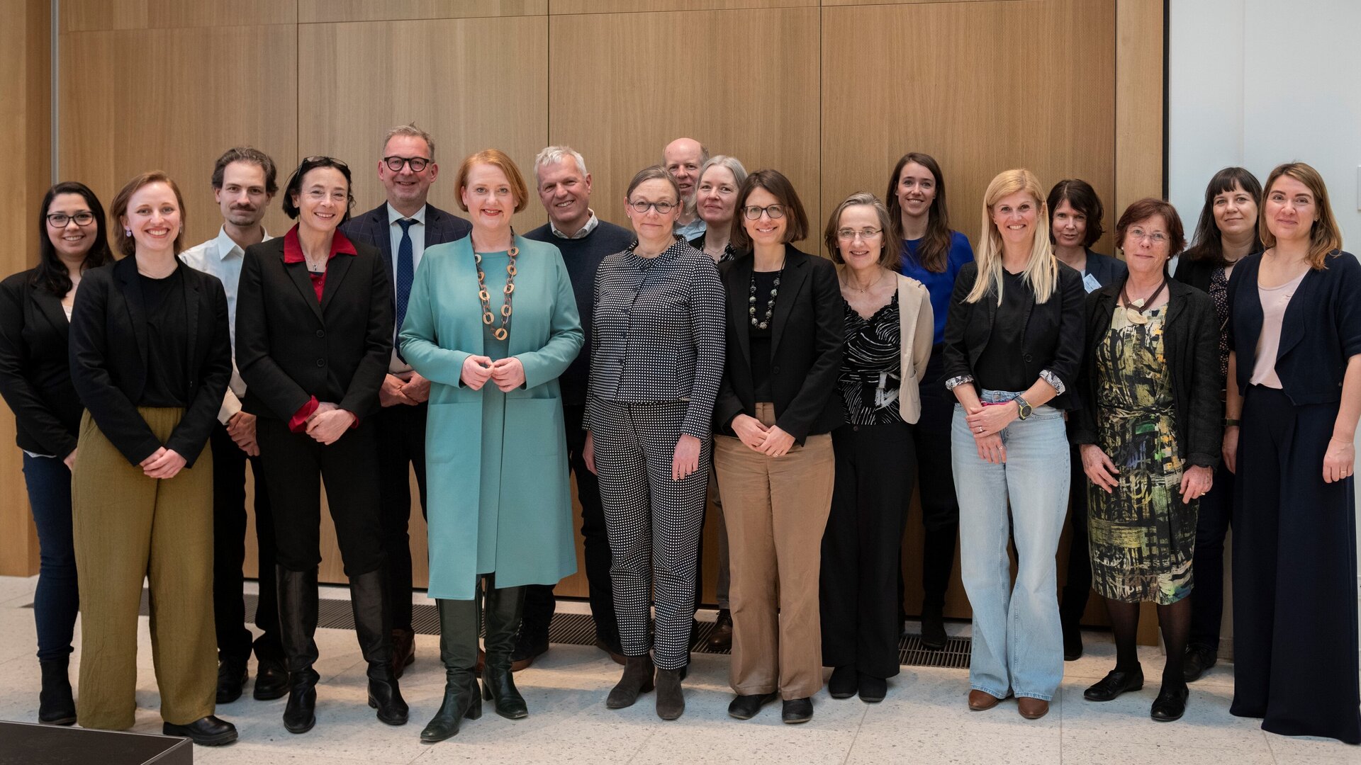 © Ostkreuz/Jordis Antonia Schlösser: Bundesfamilienministerin Lisa Paus mit der Kommission des Zehnten Familienberichts und dem Team der DJI-Geschäftsstelle