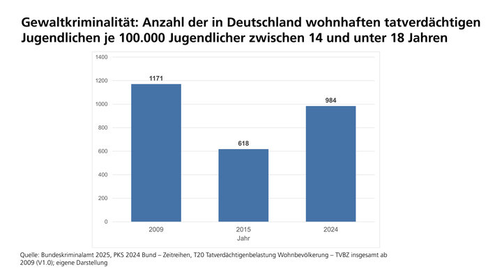Im Jahr 2024 lag die Tatverdächtigenbelastungszahl für Jugendliche zwischen 14 und unter 18 Jahren bei 984. Die DJI-Publikation „Zahlen – Daten – Fakten Jugendgewalt“ ordnet diese Zahl ein
