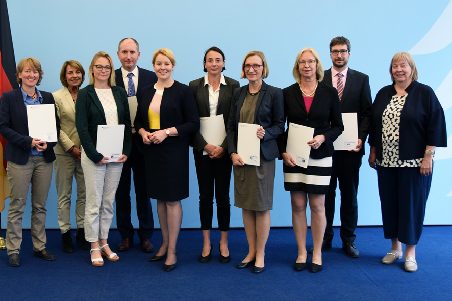 Von links nach rechts: Helen Baykara-Krumme, Petra Mackroth (Abteilungsleiterin Familie, BMFSFJ), Miriam Beblo, Axel Plünnecke, Bundesfamilienministerin Franziska Giffey, Michaela Kreyenfeld, Sabine Walper, Nina Dethloff, Reinhard Pollak, Dagmar Müller (DJI) (Foto: BMFSFJ)