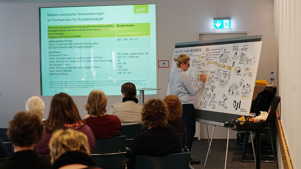 Eindrücke, Graphic Recordings und Vorträge vom DJI-Fachtag zum Thema Weiterentwicklung von Bildungswegen im System Kindertagesbetreuung