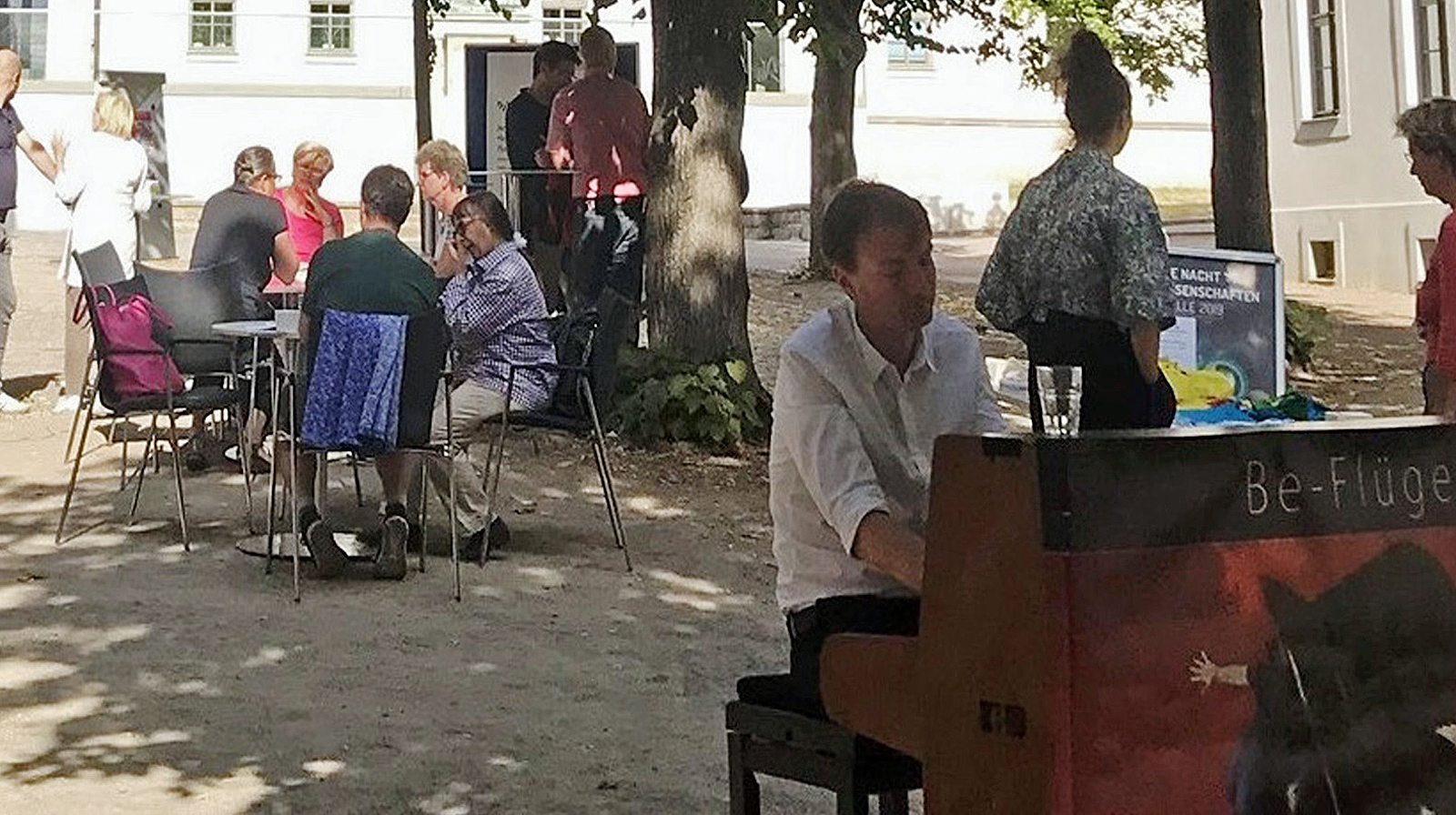 Im Mittelpunkt der Gespräche standen die Evaluation des Bundesmodellprogramms „Demokratie leben!“, die Präventionsarbeit gegen Rechtsextremismus sowie Befunde der kürzlich veröffentlichten Halleschen Kinder- und Jugendstudie. „Auch viele ältere Hallenserinnen und Hallenser hatten großes Interesse an unseren Forschungsthemen. Sie interessieren sich sehr für Probleme und Anliegen der jungen Generation“, betonte Dr. Frank Tillmann, Wissenschaftlicher Referent am DJI und Mitorganisator der Veranstaltung. Die Gäste genossen bei Kaffee und Kuchen die Klaviermusik des Pianisten Andreas Güstel (be-flügelt Leipzig).