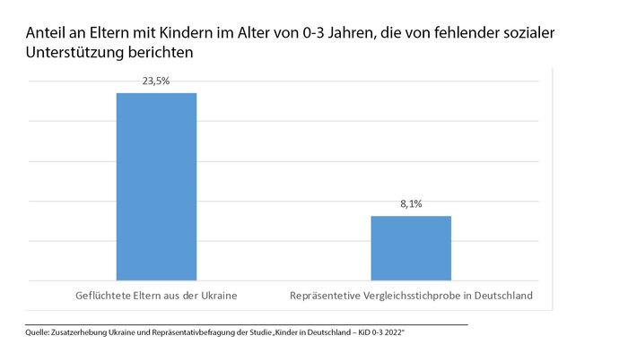 Werdende Eltern und Familien mit jungen Kindern, die in den letzten Jahren aus der Ukraine nach Deutschland flüchten mussten, befinden sich in einer doppelt schwierigen Situation: Zusätzlich zu den Herausforderungen rund um Geburt und erste Lebensjahre eines Kindes haben sie Belastungen aus Kriegs- und Fluchterlebnissen zu bewältigen. Was ihnen häufig fehlt, ist soziale Unterstützung, beispielsweise durch Großeltern oder Freundinnen und Freunde: 23,5 % der geflüchteten ukrainischen Eltern mit Kindern im Alter von 0 bis 3 Jahren berichten davon im Vergleich zu 8,1 % aller Eltern in Deutschland, die Kinder im selben Alter haben.