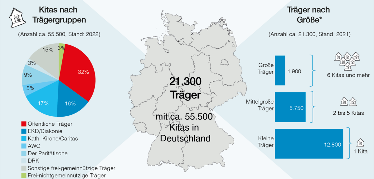 Bisher lagen nur wenige Daten über die Ebene der Einrichtungsträger von Kitas vor. Diese haben jedoch als rechtsverantwortliche Organisationen für die Kitas einen maßgeblichen Einfluss auf die Qualität der Einrichtungen. Es konnten zwar Analysen durchgeführt werden, wie viele Kitas zu welcher Trägergruppe gehören, also ob sie beispielsweise von öffentlichen oder freien Trägern betrieben wurden. Nun wurden jedoch erstmals die konkrete Anzahl der Träger und ihre Größe mithilfe von Einrichtungsträger- und Kita-Listen von Forschenden des Deutschen Jugendinstituts (DJI) und der Arbeitsstelle Kinder- und Jugendhilfestatistik (AKJStat) zusammengetragen und analysiert.