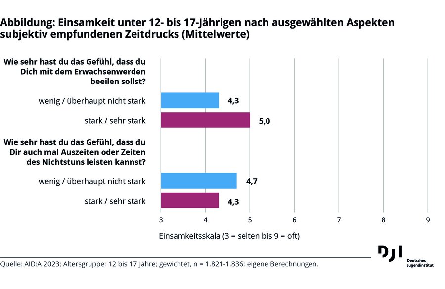 Schulabschluss, Berufswahl, Auszug aus dem Elternhaus – die gesellschaftliche Erwartung, diese Schritte auf dem Weg des Erwachsenwerdens möglichst reibungslos und zielstrebig zu bewältigen, kann Zeit- und Leistungsdruck erzeugen. Dies geht bei jungen Menschen mit einer erhöhten Einsamkeit einher, wie aktuelle Auswertungen des DJI-Surveys „Aufwachsen in Deutschland: Alltagswelten“, kurz AID:A, erstmals belegen: Demnach fühlen sich unter den 12- bis 17-Jährigen diejenigen signifikant häufiger einsam, die stark oder sehr stark das Gefühl haben, sich mit dem Erwachsenwerden beeilen zu müssen, als Gleichaltrige, die weniger Stress und Zeitdruck empfinden (Mittelwert 5,0 vs. 4,3). Umgekehrt fühlen sich diejenigen seltener einsam, die stark oder sehr stark das Gefühl haben, sich auch mal eine Auszeit oder Zeiten des Nichtstuns leisten zu können als diejenigen, die sich das wenig oder überhaupt nicht vorstellen können (Mittelwert 4,3 vs. 4,7). Erfasst wurde die Einsamkeit anhand der Kurzform der UCLA-Einsamkeitsskala (University of California, Los Angeles) mit Ausprägungen von „3 = selten“ bis „9 = oft“.[1]