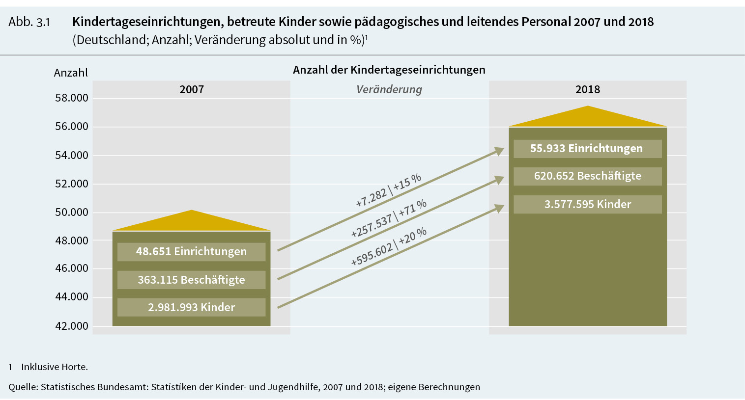 2018 wurden rund 3,6 Millionen Kinder in 56.000 Einrichtungen betreut. Dem vorangegangen ist ein enormer Personalausbau: Seit 2006 ist die Zahl der pädagogisch und leitend Tätigen um 76% auf aktuell 620.700 gestiegen. Mit der Expansion gewachsen sind auch die Kindertageseinrichtungen und ihre pädagogischen Teams. Die durchschnittliche Anzahl der pädagogisch und leitend Tätigen in den Teams ist von 7,5 im Jahr 2007 auf 11 Personen 2018 gestiegen. In jeder vierten Einrichtung sind Teams mit mehr als 14 Fachkräften tätig. Während die Beschäftigung in Kindertageseinrichtungen anhaltend boomt, verzeichnet die Kindertagespflege dagegen kaum Personalzuwachs. Die Zahl der Tagesmütter und -väter ist im selben Zeitraum nur um 1,6% auf 44.200 gestiegen.