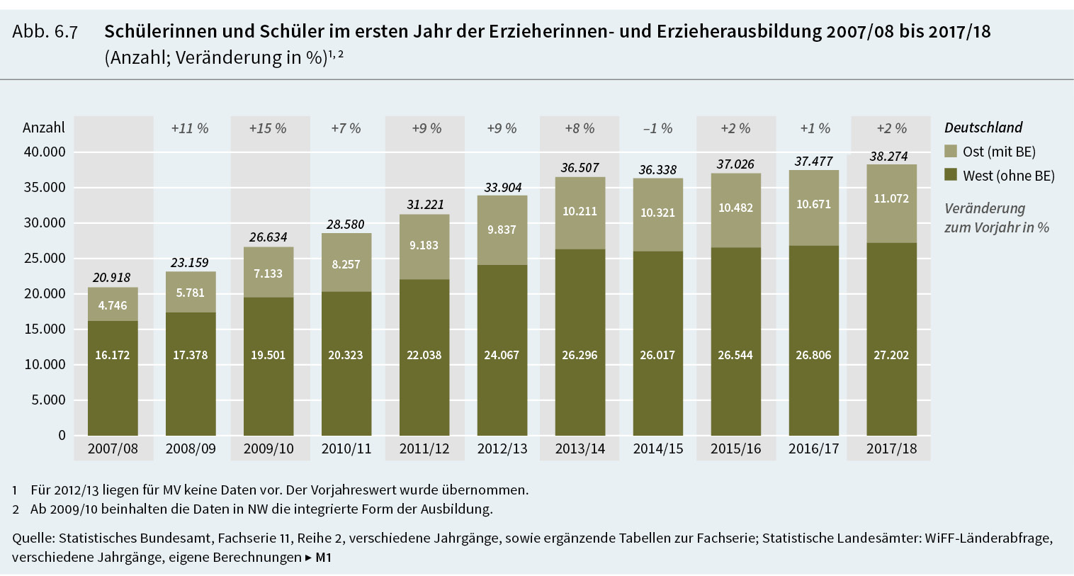 Um die Zahl der dringend benötigen Nachwuchskräfte weiter zu erhöhen, haben die Länder die Fachschulen für Sozialpädagogik, an denen Erzieherinnen und Erzieher ausgebildet werden, enorm ausgebaut. 32.000 Absolventinnen und Absolventen haben dort im Schuljahr 2016/17 eine Ausbildung abgeschlossen. Eine zuvor nie erreichte Zahl von 38.000 Personen hat im Schuljahr 2017/18 eine Ausbildung zur Erzieherin und zum Erzieher begonnen. Doch die jährlichen Zuwächse bei den Anfängerinnen und Anfängern werden schwächer und auch die demografische Entwicklung zeigt nach unten: 2016 haben 12% weniger Schülerinnen und Schüler als noch 2006 eine allgemeinbildende Schule beendet. Um dennoch genügend angehende Erzieherinnen und Erzieher zu gewinnen, bieten die Länder neben der Regelausbildung, die in Vollzeit und ohne Vergütung erfolgt, weitere Modelle in Teilzeit oder berufsbegleitend, mit und ohne Anstellungsvertrag in einer Einrichtung an. Ein hohes Rekrutierungspotenzial verspricht sich die Politik vor allem durch die vergütete, praxisintegrierte Ausbildung (PIA), die 2018 in Bayern, Baden-Württemberg, Bremen, Hessen, Nordrhein-Westfalen und Schleswig-Holstein angeboten wurde. In diesen Ländern sind die Anfängerinnen- und Anfängerzahlen im Zeitverlauf insgesamt stabiler.